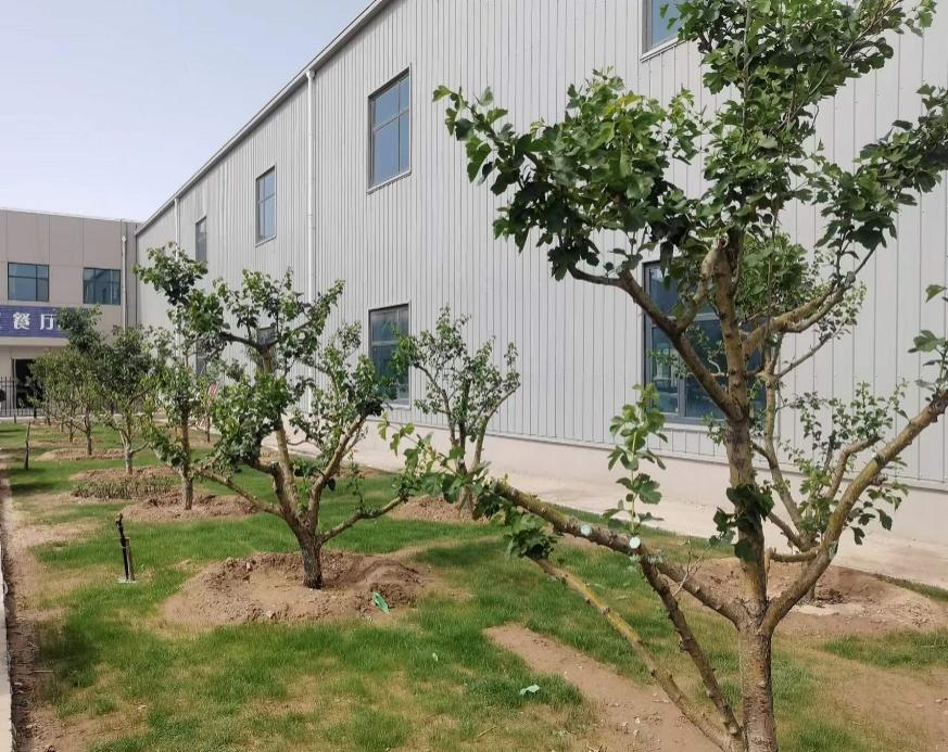 因地制宜,确定绿化方案。公司以“净化美化环境,改善区域小气候”为绿化主要原则,按功能区对厂区空地进行不同的绿化布置。在厂区北门口两侧种植9棵梧桐树,象征着栽桐引凤之意。厂区主干道路两侧选用高大阔叶乔木树种,绿化带内种植草坪,办公楼两侧栽植四季玫及常青圆柏冬青球组合,厂前区栽植山楂树,厂区西侧栽植山楂树、杏树和梨树。