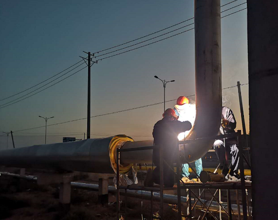 热力管网一期项目位于兰州新区绿色化工园区南区块,由兰州新区化学工程有限公司承建,主要负责为园区企业提供生产所需的蒸汽及采暖所需的热水。该项目主管网已于2019年11月全线贯通,并投入使用。后期因新入园企业的增加,导致原管线预留口及企业门头桁架发生变更需改迁。为了不影响园区企业生产运营,石投集团经过多方协调,商定于9月29日早上七点停汽。此次热力管网管道改迁工作任务紧,难度大,工程公司迎难而上,通过前期对图纸的精研,科学组织,精准施策,经过15个小时连续奋战,最终完成6座企业门头桁架蒸汽管道的改迁、6处新增蒸汽预留接口的安装及2处DN400旋转补偿器位置的变更。