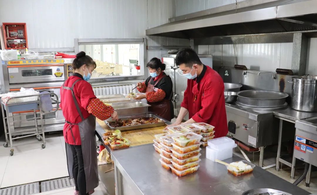 疫情防控期间,为了保障一线工作人员吃饭问题,化学工程公司、专精特新公司、化工热电公司三家食堂分别承担了防疫工作人员以及周边下沉村工作人员的盒饭配送。自3月6日以来,每天中、晚餐共要制作配送400多份盒饭到各个下沉村、园区核酸检测点以及执勤点。深知一线防疫人员工作强度大,为此,食堂每天精心搭配膳食,午餐和晚餐实行两荤两素,并且做到每天更换一次菜品,为大家提供营养美味的饭菜。为抓好食堂疫情防控工作,确保各方安全,食堂对所有员工定时进行核酸检测,上下岗都进行体温测量,工作期间要求全程佩戴口罩,内部场所、餐具用品等也都进行了全面严格的消毒。